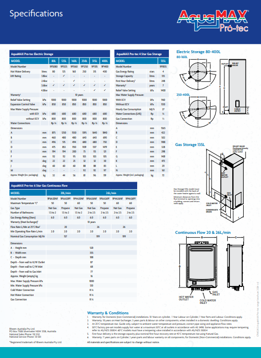 Made in Japan and featuring 6-star gas energy rating, AquaMAX Pro-tec gas continuous flow models are backed by a 10 year heat exchanger warranty.