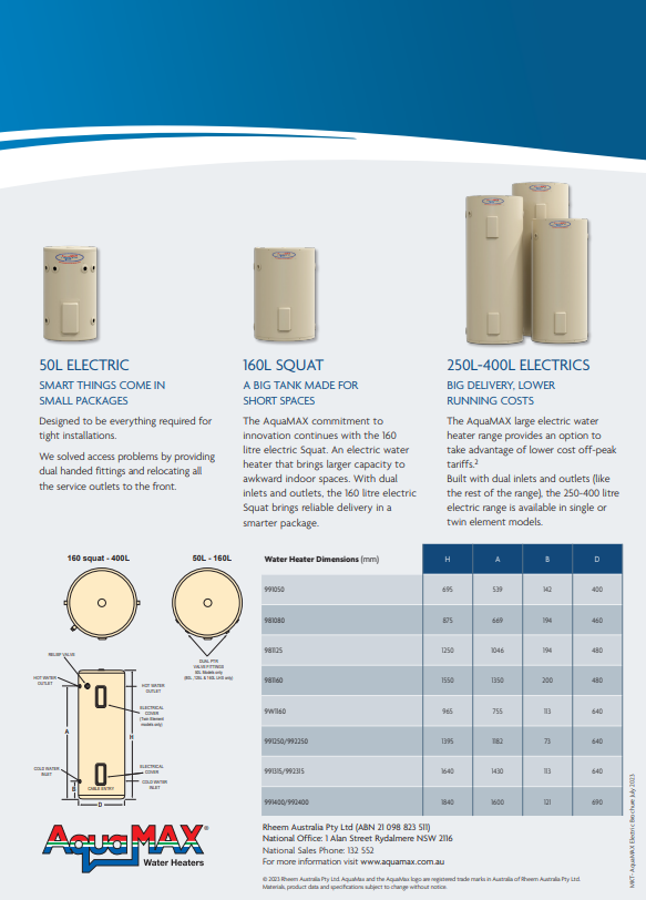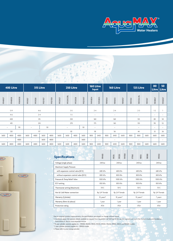 Aquamax Pro-tec 160L: The AquaMAX 160L electric water heater is suitable for households of up to 5 people