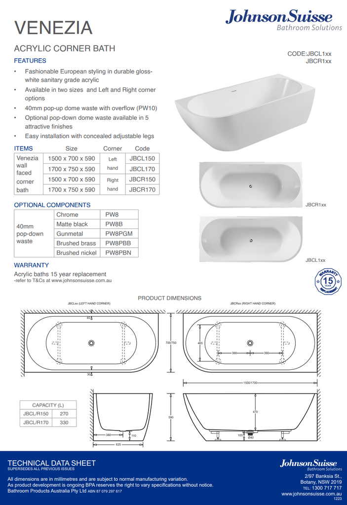 - Generous depth and 270L (1500mm) / 330L (1700mm) capacity
